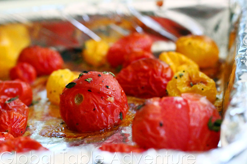 Serves 2-3 Cherry tomatoes are sweet bursts of summertime. Their flavor deepens when roasted with creamy butter and fresh thyme – a juicy side dish that forgives even the driest chicken and wild rice, while bravely complimenting perfectly cooked meals as well. If that isn’t enough reason to try this vegetarian recipe, these tomatoes actually made my picky husband exclaim “pretty good!” That’s quite the milestone considering the tomato is one of his major food nemeses. Like Batman’s Joker or Superman’s Ingredients: 2 Tbsp butter (or olive oil) 1 pint tomatoes (grape, cherry, or other) 1-2 sprigs fresh thyme leaves Method: Run to your farmer’s market and pick up a basket of beautiful cherry tomatoes. Eat one or two. I won’t tell! When you get home, preheat the oven to 375F Melt some butter over low heat (or you can use olive oil for a vegan version of this dish) Rinse tomatoes and place in a bowl Bathe them in melted butter Sprinkle with fresh thyme – pull the leaves off of 1-2 sprigs. Always pull …
