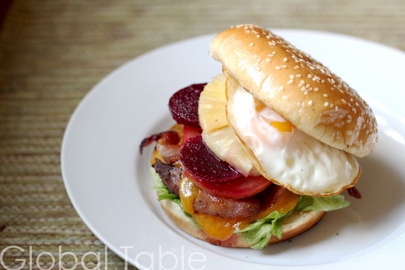 Serves 8 We had great fun with the Aussie Burger at our barbecue. Follow my tips to help you if you are expecting a big group of people. The pickled beetroot is a lot like pickle, so don’t be shy! Ingredients: 8 hamburger buns 8 beef patties (or turkey) Toppings (all to taste): cooked bacon sliced cheddar cheese red onion, sliced thin into rings tomato, sliced thin pickled beetroot (beet), sliced thin lettuce pineapple rings 8 fried eggs, sunny side up Method: 1. Grill beef patties on a hot grill until done to your preference. A minute or two before taking the meat off of the grill, top burgers with bacon and cheese. Toast buns on the grill. 2. Assemble burger in the order given, starting with bacon and ending with eggs. Enjoy! TIPS: How to make fried eggs for a crowd Oil a sheet pan or cookie sheet. Heat an oiled griddle over medium high and crack eggs on it. Cook until white is set on the bottom, but top is still translucent. Move eggs …