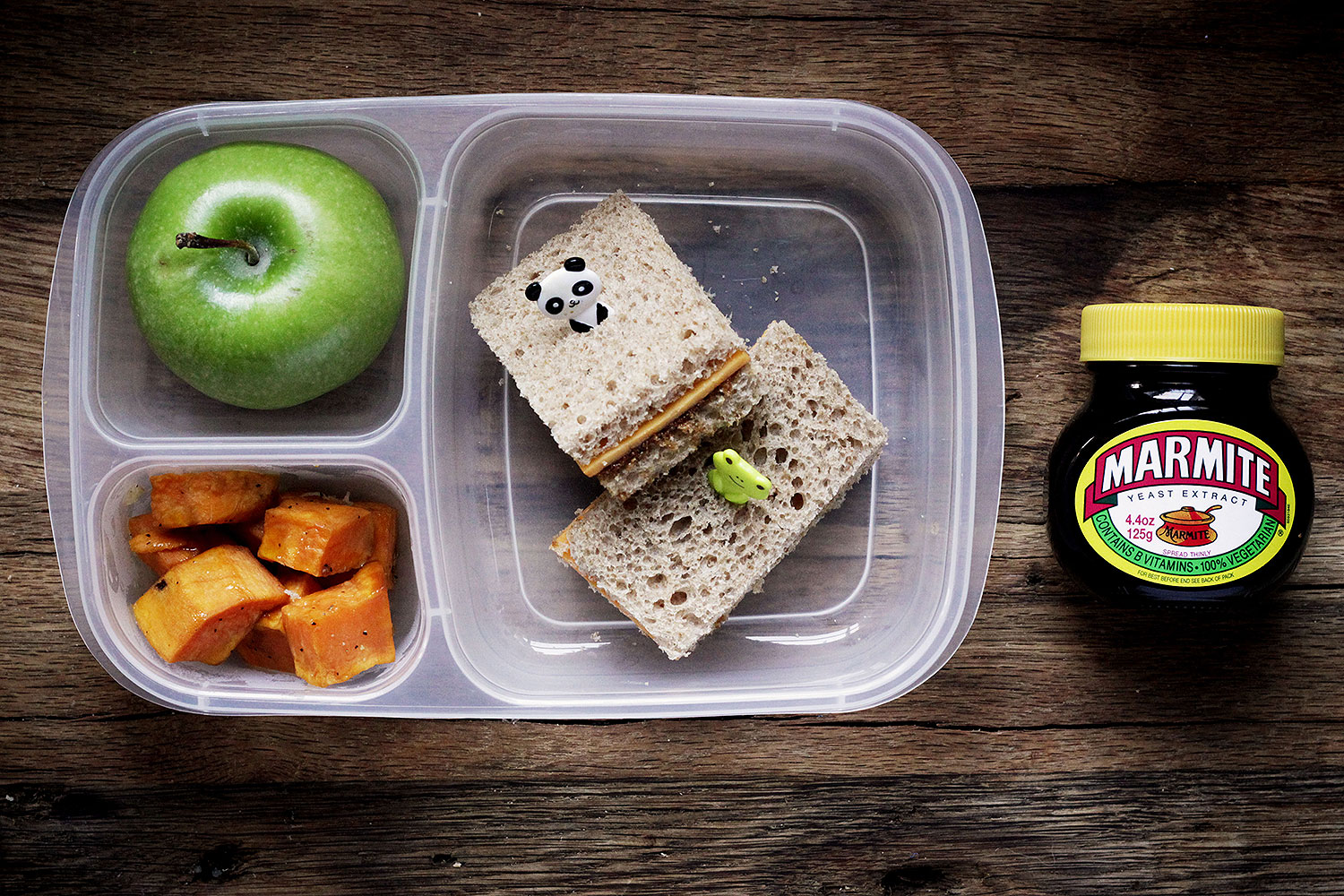 Throwing together a Down Under lunch requires just a few fun ingredients. My kindergartner loves a good cheese sandwich (don’t we all!?) so this week I smeared her sandwich bread with sticky, salty yeast extract like they do in Australia and New Zealand (I couldn’t find Aussie’s preferred version, Vegemite, so I used Marmite, the version preferred in Britain and New Zealand). Let the record state: ooey gooey cheese paninis with yeast extract are also grand! The salty smack goes a long, long way; don’t overdo it! Next, leftovers came to the rescue. On the side are leftover sweet potatoes drizzled with a little olive oil, salt and pepper. In New Zealand and parts of Australia they call sweet potatoes “kumara.” The shining star of the meal came from the fruit basket: one shiny Granny Smith apple. These green beauties were first cultivated in Australia in 1868. What an easy, authentic addition to the lunch box. The container came back empty, so I’d say her lunch “down under” was a success! Tips & Tricks: Ava’s lunch is vegetarian but others might enjoy tossing the sweet potatoes …
