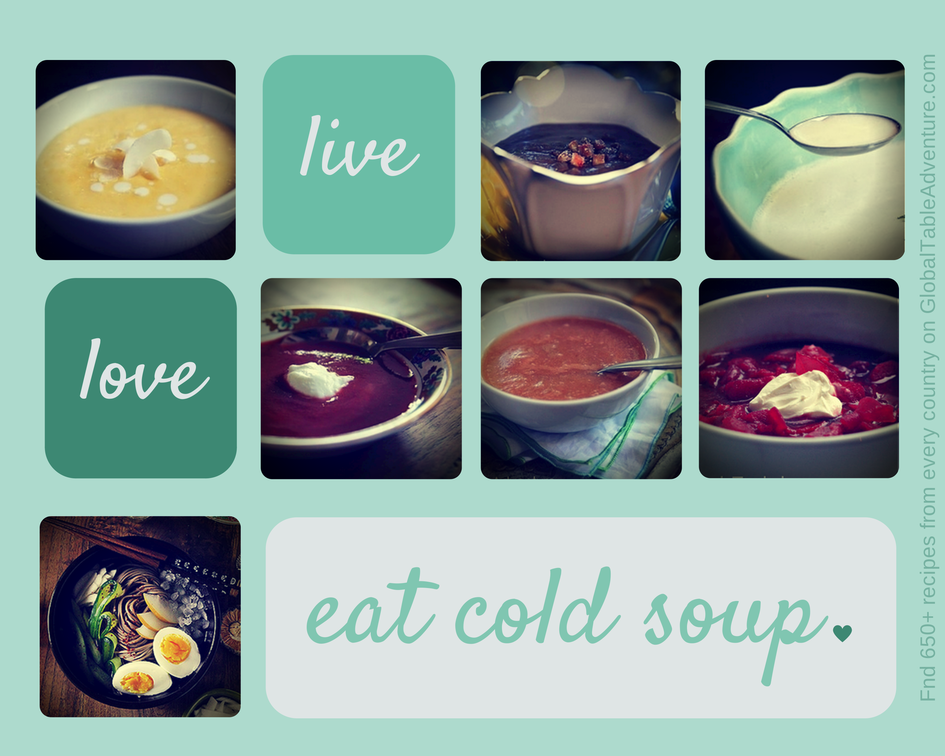 A few things have changed since the early days of this blog (namely the photography), but one thing is certain: I love a good, chilled soup in the summer. Here are seven awesome cold soup recipes from around the world that aren’t gazpacho – because, my goodness, there are other cold soups besides gazpacho! So, without further ado, summer’s almost over – let’s skip the heat and chill out. 1. Mul Naengmyeon | Korea [Recipe] This Korean recipe is the most recent addition to our collection – a soup so cold, it is actually served with ice. It’s claim to fame? The balance of flavor between earthy buckwheat noodles spicy cucumber, sweet Asian pear, and tart vinegar. The best part? This soup is DIY, so everyone can add exactly what they like (and leave out the rest) – perfect for picky eaters who want to stovetop travel to Korea! 2. Rye Bread Soup with Homemade Rhubarb Raisins | Iceland [Recipe] A soup made with bread? Yup. It’s thick, heavy on the rye, and just odd enough to get …