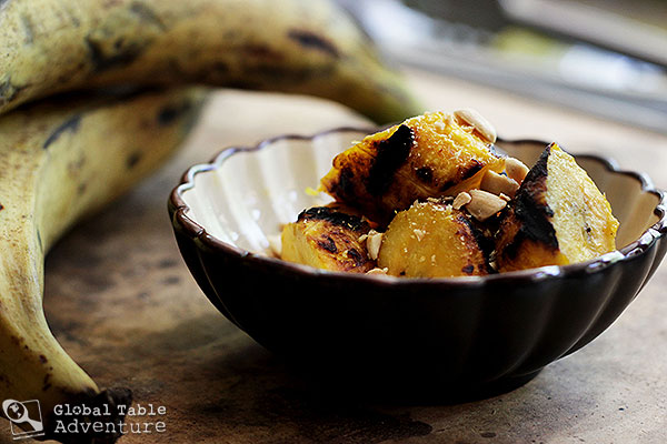 This is so quick, it’s silly. All you need are a few medium-ripe plantains (as pictured), some red palm oil, and a bit of salt & hot pepper. You can find the red palm oil at your natural grocer or, if you’re lucky enough to have an African market, there. You brush on the red palm oil (back in the day I wrote a bit about this popular west African oil)… Sprinkle with salt and whatever spices you like (think hot, like cayenne… or mild, like paprika)… Grill until tender and charred, but not mushy. Slice and serve… … preferably with crushed peanuts and a sprinkling of extra spices, as desired. This would also be great with minced chili peppers, like jalapeno. That’s it! A quick and relatively fuss-free taste of Nigeria. Adapted from The Africa Cookbook: Tastes of a Continent by Jessica Harris. Here’s what you need… Ingredients: 3 plantains 1-2 Tbsp red palm oil handful crushed peanuts salt cayenne pepper, optional Grilled Plantain spears with crushed peanuts | Boli Bopa Votes: 0 Rating: 0 You: Rate …