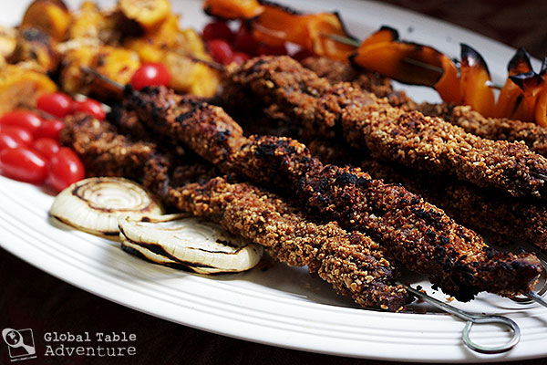 My pantry’s name is Patty.* She’s actually just a shelf in the laundry room, above the vacuum cleaner and mop, but I love her all the same. Right now she could use a diet – she is packed with boxes upon boxes of noodles, rice, 8 kinds of oils, soup, 4 bags of coffee from around the world, 4 kinds of dried chili peppers, and fishy bouillon cubes I bought 2 years ago for one of our Global Table meals and promptly forgot to use (I’m going to go ahead and presume they aren’t good any more). Just the other day I unearthed three bulk bags of peanuts in the back corner of the shelf. This is what happens when Patty is in disorder. When I don’t clear through her clutter. I’ve never been happier to have too many peanuts in my pantry. It means I get to make Suya, west African Peanut Kabobs. These kabobs, ever-so-popular in Nigeria, crackle with the most addictive crust – ground peanuts seasoned with fresh ginger, garlic, paprika, onion powder, and …
