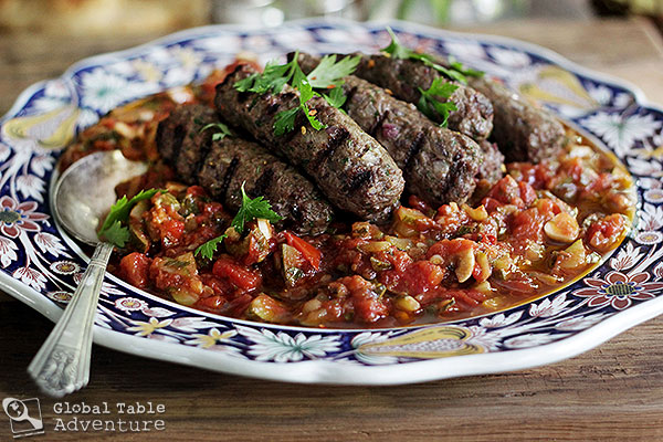 This week we dove into a summery garden spread from Oman. Kofta are grilled hand-formed sausages enjoyed in Oman and neighboring countries. In fact, versions of kofta are enjoyed as far east as India (although these are typically served in meatball form). These Omani kofta sizzle with earthy cumin, warm flutterings of cinnamon, and are rounded out by coriander seed, fresh parsley and cilantro. The sauce – entirely vegan, by the way – is loaded up with fresh zucchini, garlic, parlsey and such a little sprinkle of mint, noone will know what your secret ingredient is. You can make it as spicy as you’d like with red pepper flakes (or go wild with cayenne, if you must). P.S. This sauce would be great for a variation on our vegetarian Shakshouka that we made back with Israel. Shakshouka is also enjoyed in Oman. Recipe adapted from Laura Kelley at Silk Road Gourmet, where she journies through the cuisines, histories and cultures of the more than thirty countries that traded goods along that great lifeline of the ancient world. Ingredients: For …