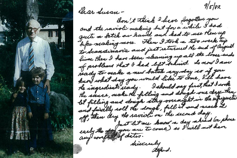 Alfred lived to 103 and I attribute that partly to the fact that he continued making ravioli two-three times a year, well into his nineties. He’d make a few hundred at a time, spreading out the work over several days (you can read his letter below to see exactly what he did).