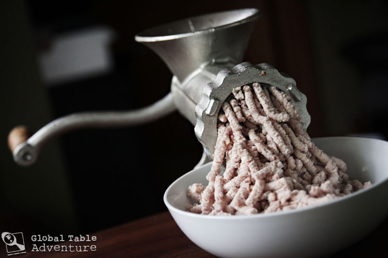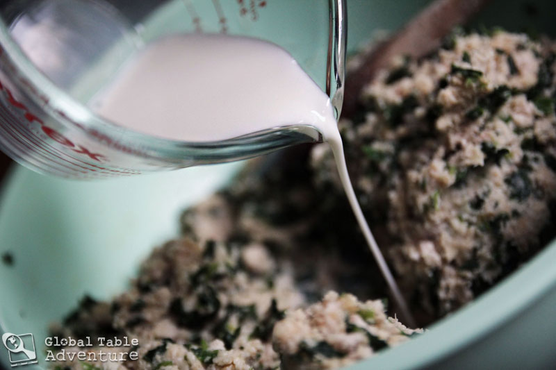- Debone and grind the pork chops. Next, mix pork with spinach, eggs, breadcrumbs, Parmesan, nutmeg, pepper, milk, and olive oil. Adjust consistency with more milk if needed. It should be thick but easily spreadable.