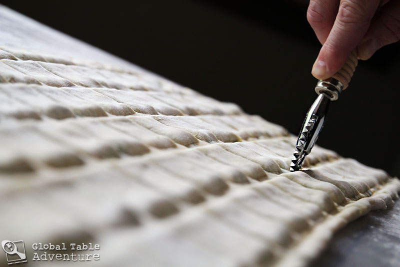 Next, line up the ravioli rolling pin in order to get the most ravioli out of the piece of dough you’re working with. Slowly roll and press firmly to crimp the ravioli well.