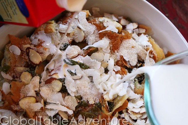 3. Toss on the raisins, slivered almonds, and coconut chips. Dust with sugar and drizzle on the half and half and milk. Be sure to spread it evenly over the entire casserole.