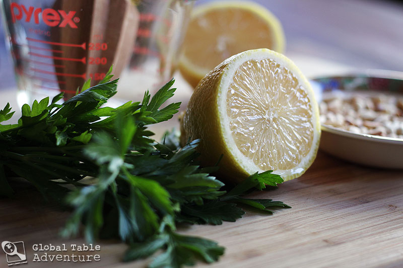 Finally, scoop out four cups of eggplant flesh and add it to the processor with lemon juice, tahini, and parsley. Pulse, drizzling in olive as needed – I used about 1/4 cup. The mixture should take on a hummus-like consistency.