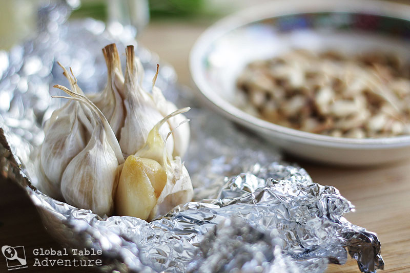 - Roast the foil-wrapped garlic for 20 minutes, removing from oven while the eggplant finishes up. Set both aside until cool enough to handle.