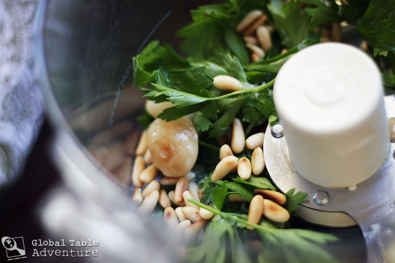Toast the pine nuts over medium heat in a clean dry skillet until golden brown, stirring continually. Add half to a food processor, reserving other half for garnish. Pop the garlic cloves out of the skins and add them to the processor as well. Try not to gobble them all up at once!