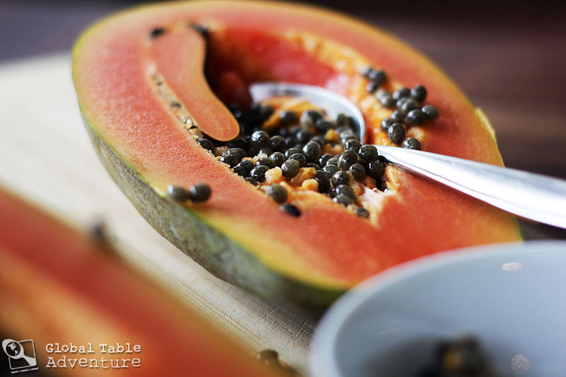 Cut open the ripe papaya and scoop out the sparkling black seeds.