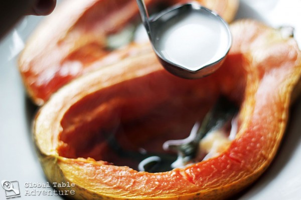 6. Remove from oven and immediately ladle some coconut milk into each half.