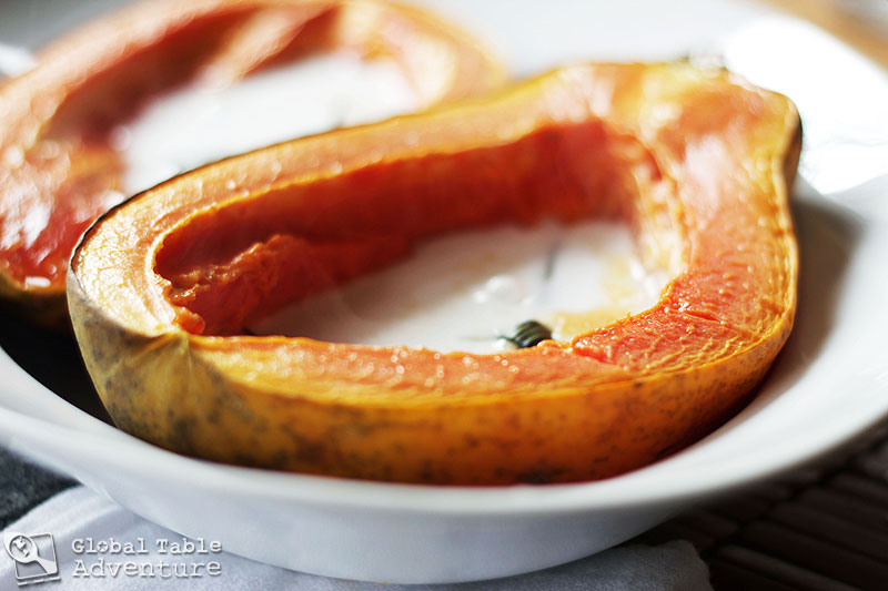 Remove from oven and immediately ladle some coconut milk into each half in order to warm it.