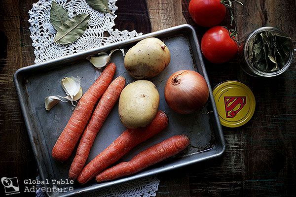 4. Prepare the remaining ingredients... chop the carrots, tomato, and onion, dice the bacon, mince the garlic, chop the onion.