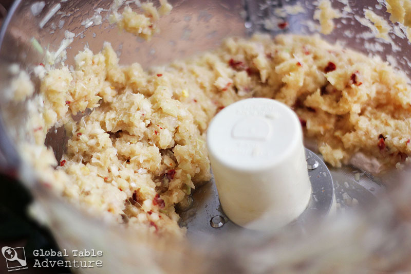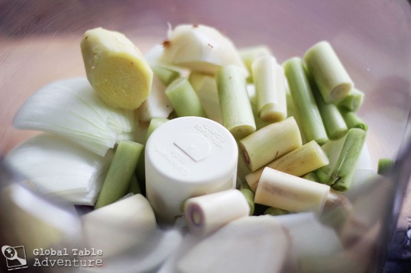 - Chunk up the lemongrass, ginger, galangal, garlic, onion, and Japanese Chili peppers (if desired) and add to the bowl of a food processor. Blend into a fine paste.