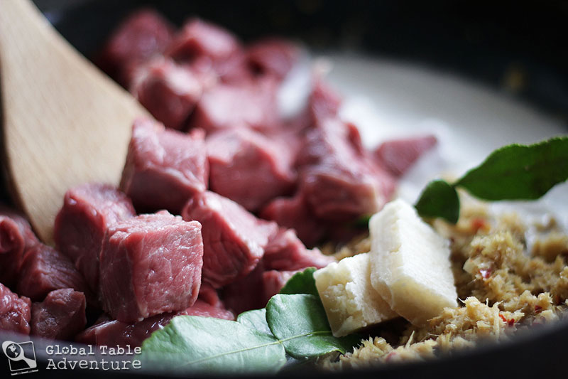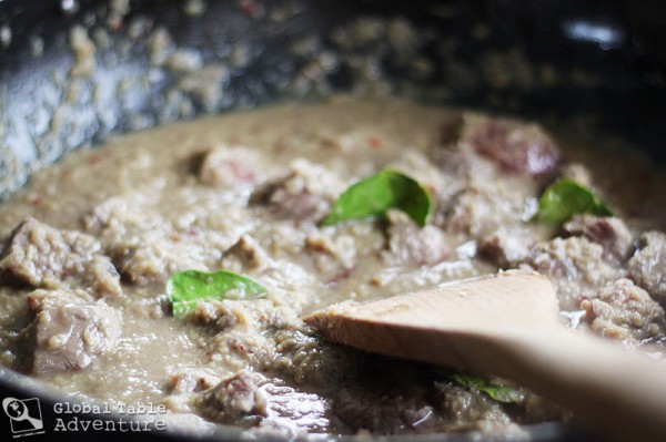 - Next, add on the beef, coconut milk, water, sugar, and kaffir lime leaves. Give it a stir and let simmer for about an hour.