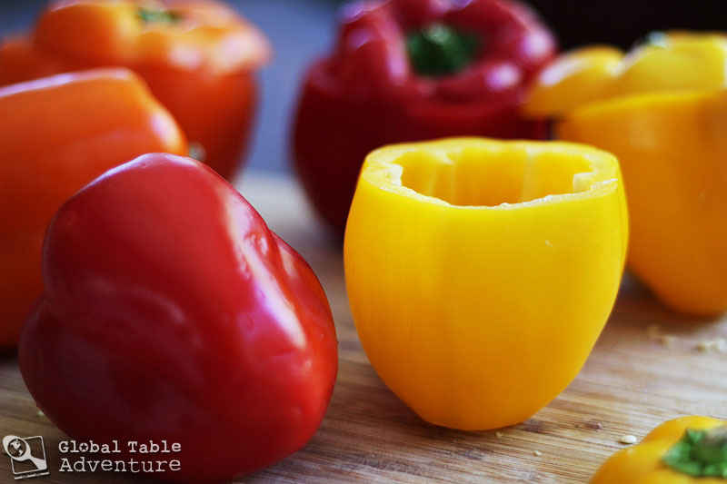 - Cut off the tops of your peppers and trim the bottom so they sit flat.