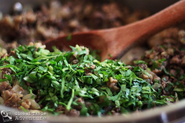 First, in a large skillet brown the sausage, beef, garlic, garlic, and onion in oil. The sausage adds the best flavor – don’t skip it or you’ll really regret it. It adds all the spicy unctiousness. And if that’s not a word, I’m adding it to the dictionary.