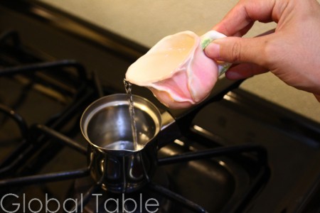 6. Pour the reserved sugar water back into the djezva (pour the liquid over spoon to rinse it off). The gentle pouring action helps bring all the coffee grounds to the bottom of the djezva. You may want to let the coffee rest a few extra moments, for the grounds to settle to the bottom.