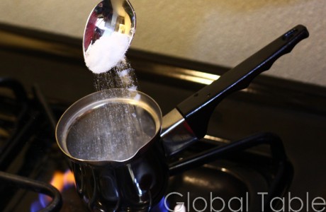 1. Fill djezva (or small saucepan) with water. Bring to a simmer. Add sugar and heat over low until dissolved.