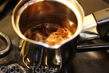 3. Off the heat, add a heaping teaspoon of coffee to the remaining sugar water in the djezva. Stir vigorously to dissolve the coffee.