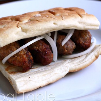 Cevapi, pronounced cheh-VAH-pee, are highly addictive mini sausages served in a special Bosnian pita bread called Somun. You may substitute either naan or other thick, doughy bread. Some Bosnians swear by quickly dipping the bread in beef broth and heating for a minute over a hot grill. The hot, slightly brothy bread with Cevapi is a bite of heaven. Simply inspired!