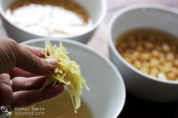 - In the cool, calm evening, prepare the first few ingredients. Soak the ginger in lemon or lime juice, and soak the dried chickpeas and lentils in water overnight. Be sure that ginger is sliced fine, fine, fine.