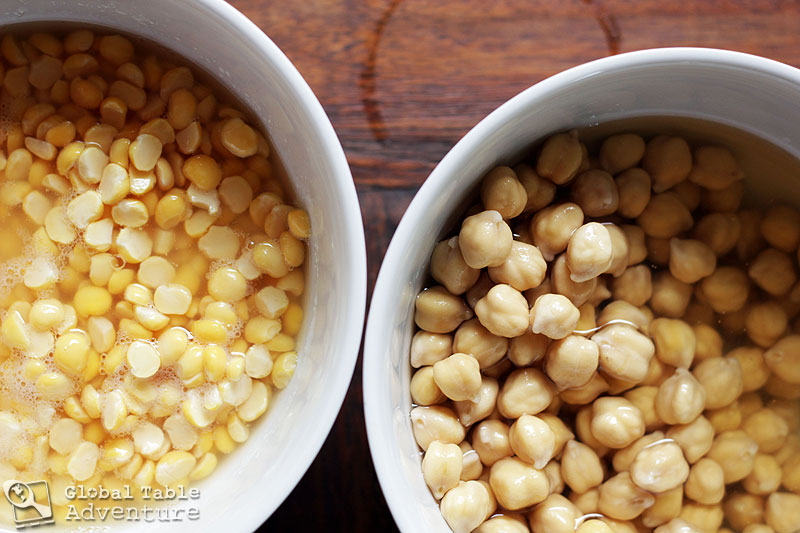 While you’re out, the overnight soak will help soften the ginger’s bite and prepare the lentils and chickpeas for a quick dip in hot peanut oil. Some people like to soak the ginger for several days; it’s up to you, but I didn’t think it necessary.