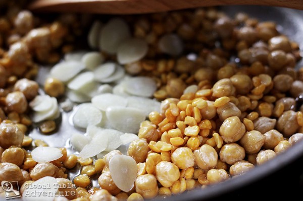 Fry the chickpeas and lentils in peanut oil until golden brown, about five minutes. Add the garlic slivers and cook until golden brown (about 1 minute).