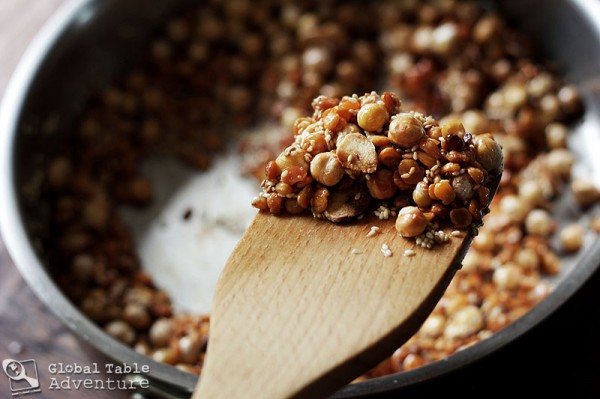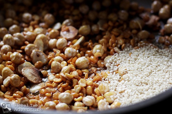- Fry the chickpeas and lentils in peanut oil until golden brown, about five minutes. Add the garlic slivers and cook until golden brown (about 1 minute). Finally, toss on the sesame seeds and fry for just 1 minute.