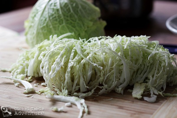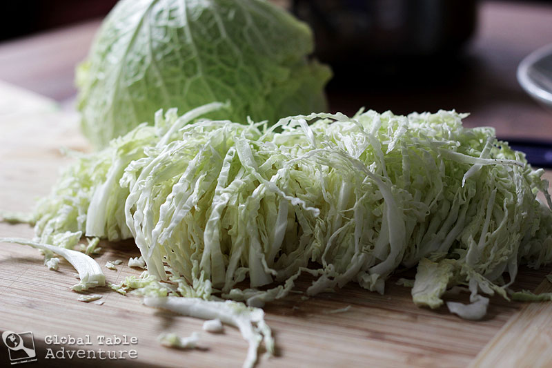 Now, nibble a few beans and set the rest aside to cool. Begin shredding the cabbage. I only needed 1/3 of a small napa cabbage for this salad.
