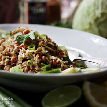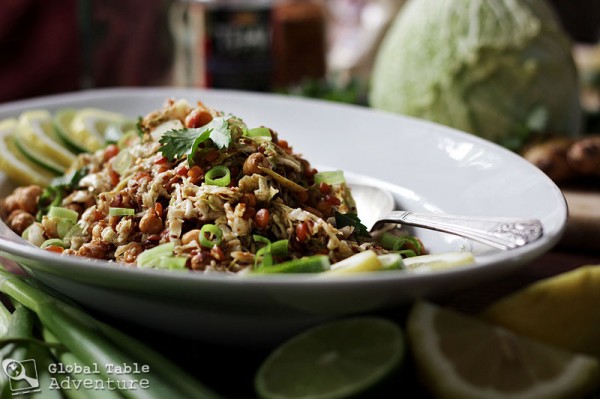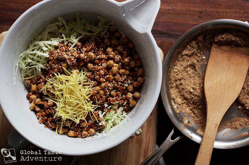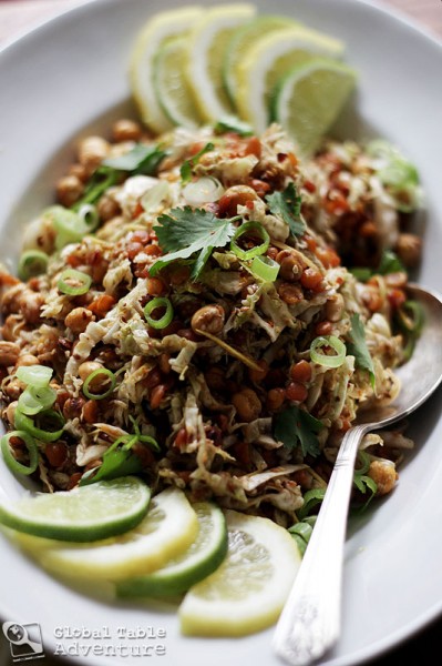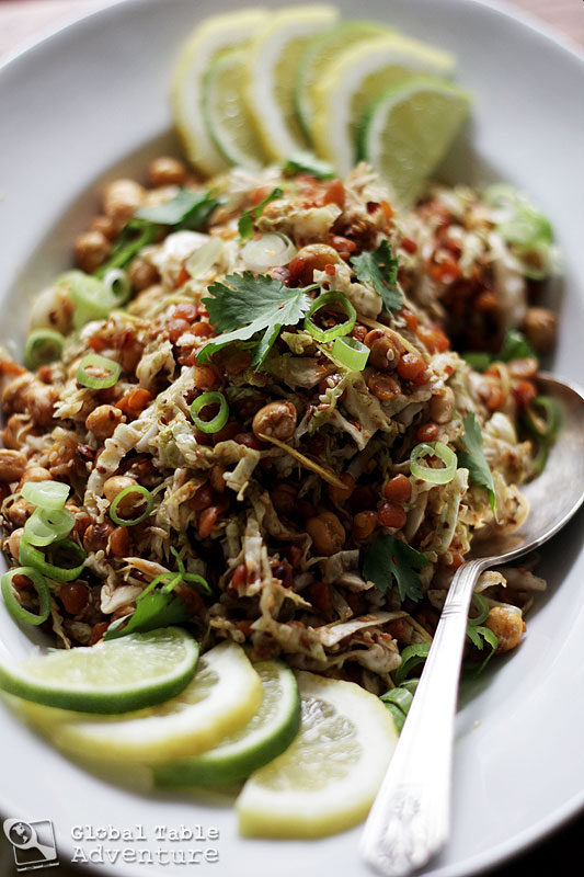 This Burmese salad is extremely well balanced, which surprised me. No one flavor dominates the other. The chickpeas and lentils add protein, the cabbage binds everything together, the ginger is the occasional spicy bite, and even the fish sauce simply adds a salty dressing when combined with the bright acidity of lime juice and lemons.