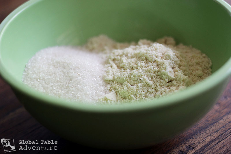 Then in a medium bowl, stir together the remaining sugar and delicious ground almonds.