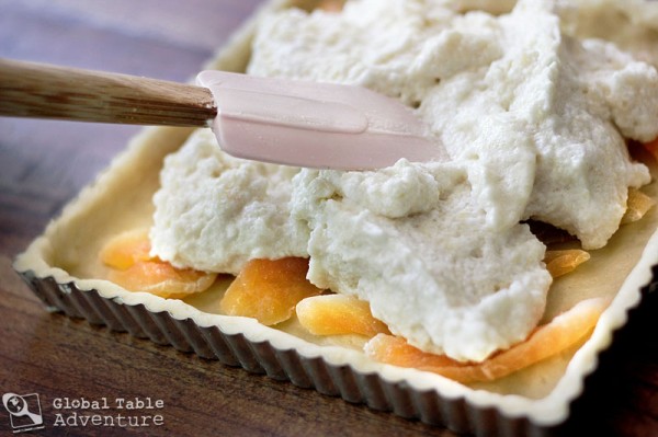 Smooth the egg white and almond mixture over the top of the candied cantaloupe.