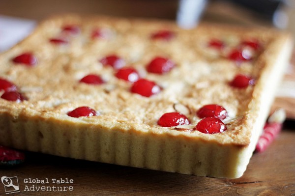 12. Decorate with cherries and sliced almonds.