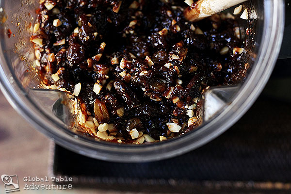 - Grease and line two 8 inch pans with a double layer of parchment paper. Blend the fruit mixture with almonds until chunky (makes about 5 cups of mixture) You can add more brandy if you need to loosen it up a bunch, but I just pushed it around with a spoon every few pulses until I reached desired consistency). Set aside.