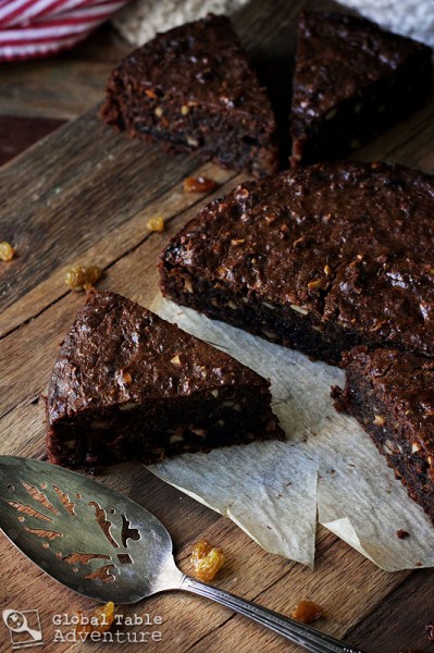 On baking day, grease and line two 8 inch pans with a double layer of parchment paper. Blend the fruit mixture with almonds until chunky (makes about 5 cups of mixture) You can add more brandy if you need to loosen it up a bunch, but I just pushed it around with a spoon every few pulses until I reached desired consistency). Set aside.