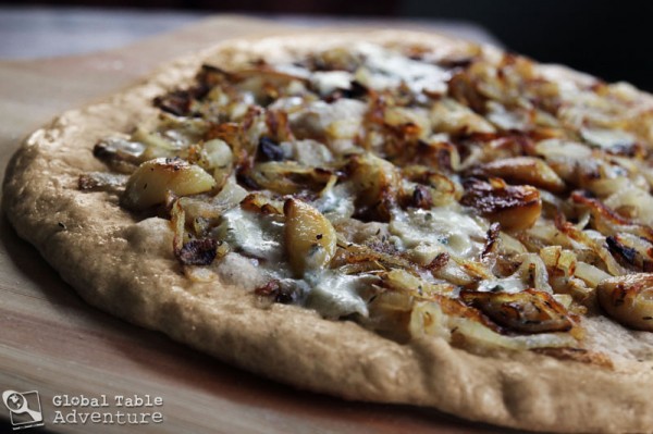 I’m partial to cashel blue, caramelized onion, roasted garlic, and fresh thyme on homemade pita dough.
