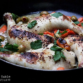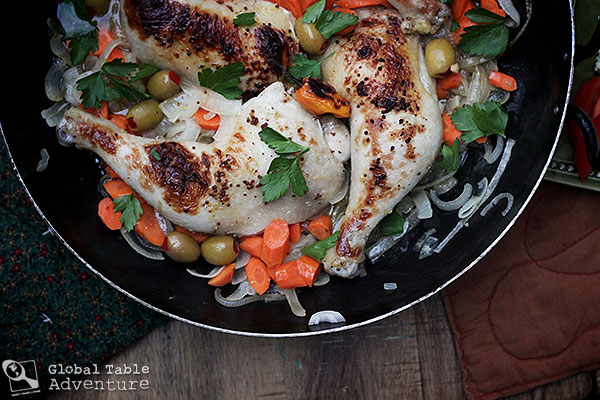 4. Next, add in the carrots, olives, and broth and marinade juices to the onion mixture. Season with salt and pepper. Stir and cook for a few minutes to start softening the carrots. Nestle the browned chicken into the onion bed and the habenero, if more heat is desired. Cover and simmer for about 45 minutes to an hour, or until the chicken is cooked through and the carrots are tender.