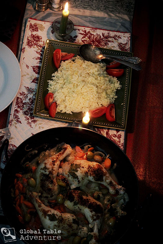 Keep simmering until the chicken starts to pull away from the bones for the most tender dish. Right before serving, sprinkle with parsley. Spoon each serving over a mound of rice, including a healthy dose of onion, broth, and salty nuggets of olive and sweet carrot.