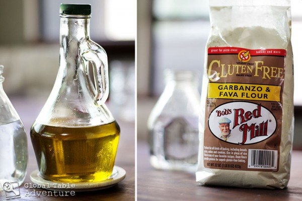 The batter is super basic. Simply whisk together the chickpea flour (aka. garbonzo bean) with water, olive oil, salt and pepper) until the mixture pours easily.