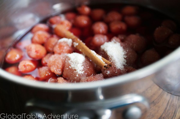 1. Add the cherries, their juices, sugar, red wine, and cinnamon stick to a medium pot. Bring to a gentle simmer for about 10 minutes.
