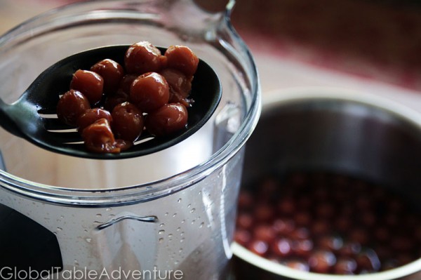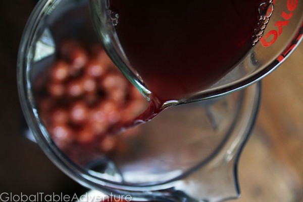 2. Add the cherries and 1 1/2 cups of the cooking liquid to a blender. If you don't have quite enough, add a little water or wine.