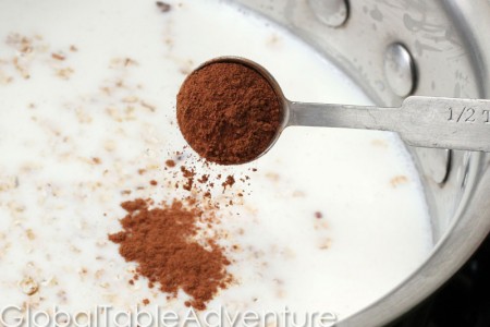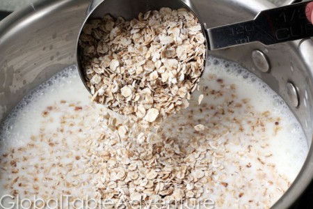 - Heat milk in a large pot. Bring to a simmer and oatmeal. I used “3 minute” Irish oatmeal. Season with cinnamon, then add sugar – white or brown, your preference.