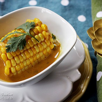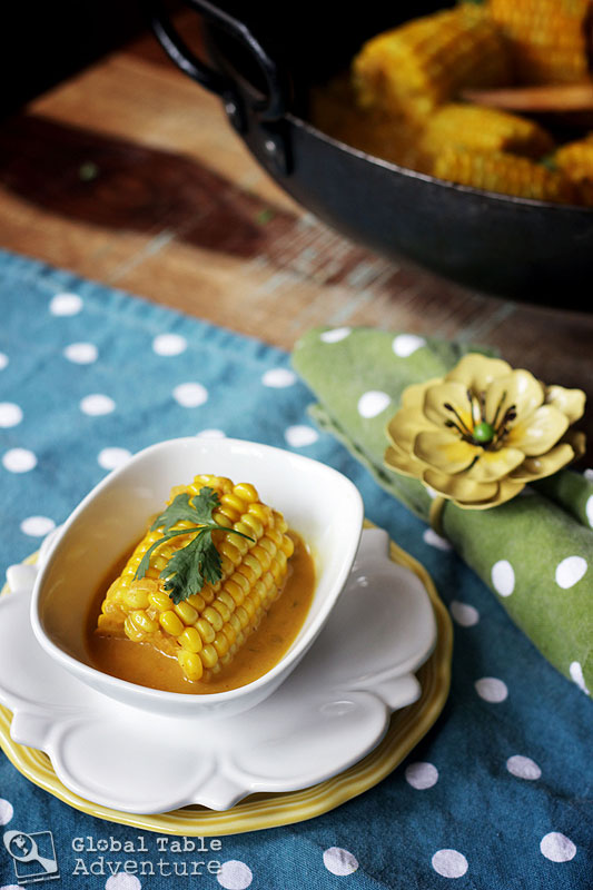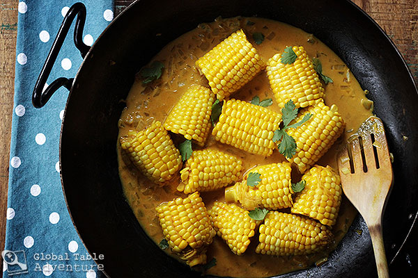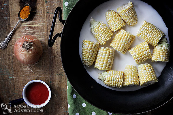 In this recipe, ears of corn simmer in a bubbling mixture of salted coconut milk, tomato sauce (just enough for a bit of acidity), sweet onion, and turmeric. The result is creamy and exotic, but not spicy. For those brave souls, a punch of heat could easily be injected with a couple of thai bird chilies, chopped and strewn into the golden sauce.