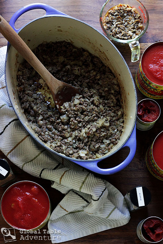 Fry the chopped onions in a 1/2 cup of olive oil until soft and sweet, then add in the beef and brown it.  While I’m sure you could use whatever onions you want, Alfred specified Bermuda, and we loved their sweet flavor in this recipe.