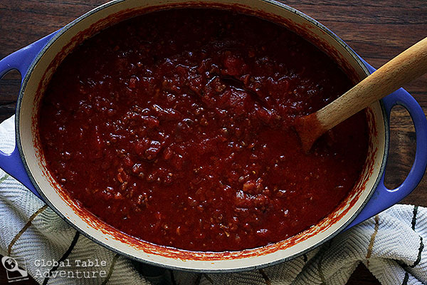 Ideally, Alfred says you should wait to eat this until the next day so the flavors have time to mingle.  He left his batch of sauce covered, on the counter overnight. I think this would encourage bacterial growth, so I suggest you refrigerate your sauce overnight.