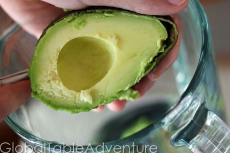 Scoop the flesh of two ripe avocados into a blender. These ones were so ripe, they were buttery-good.
