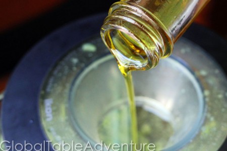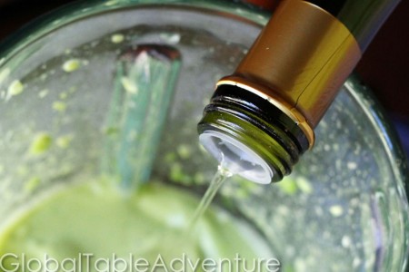 Blend things up a bit. While the machine is still running, pour some olive oil through that peep hole in the top of your blender.
