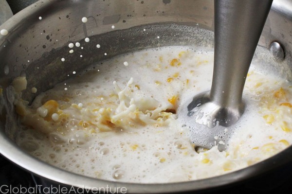 While the milk is coming to a simmer, pour on the sugar. (If you don’t have a crazy wild sweet tooth, just add 1/4 cup. Also, if your corn is ultra sweet you may not need so much).